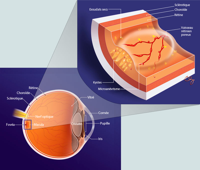 L'image illustre l'anatomie de l'œil. Elle délimite la zone de l'OMD et le site de traitement. La coupe transversale illustre le gonflement de la macula causé par l'OMD.